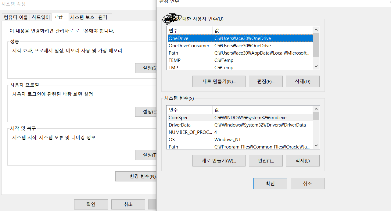 [제어판] - [시스템] -[고급 시스템 설정 보기] - [환경변수]로 따라와 주세요!