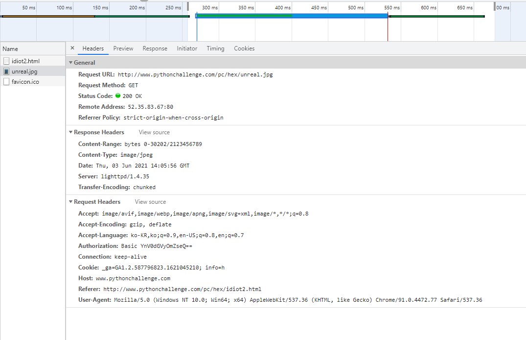 여러분과 필자가 보고 있는 이 요청정보는 idiot2.html이 아닌 unreal.jpg의 정보라는 것을 기반으로 잡고 가자. 자세히 보면 독특한 response header가 보인다. 바로 content-range라는 응답인데, 이게 전체 크기인 2123456789에서(참 대충도 짓는다. 아마 2의 32 제곱 만들고 싶었던 듯) 0-30202 bytes만을 가져온다.