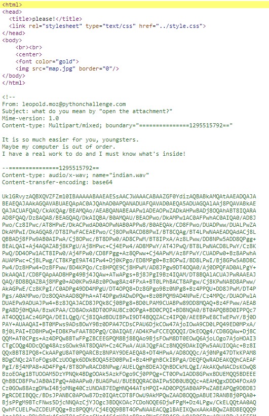 ### 20_2.py from requests import * if __name__=="__main__" : header = {"Authorization" : "Basic YnV0dGVyOmZseQ==", "user-agent" : "Mozilla/5.0 (Windows NT 10.0; Win64; x64) AppleWebKit/537.36 (KHTML, like Gecko) Chrome/91.0.4472.77 Safari/537.36", "Range": "bytes=1152983631-/2123456789" } url = "http://www.pythonchallenge.com/pc/hex/unreal.jpg" res = get(url,headers=header) with open("somefile","wb") as f: f.write(res.content)