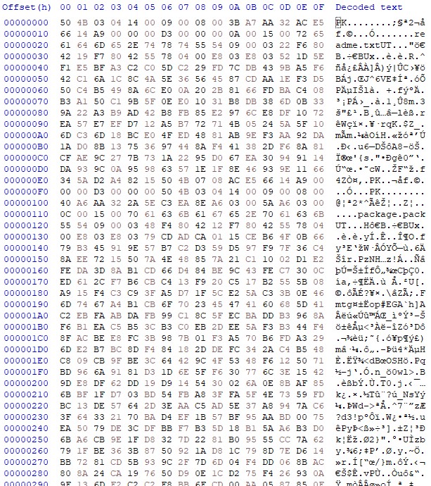 헤더 시그니처를 보니 ZIP 파일이다. 503B0304는 국 룰이다.