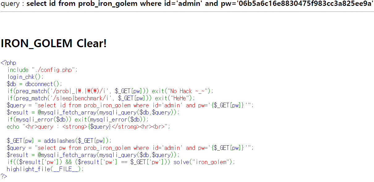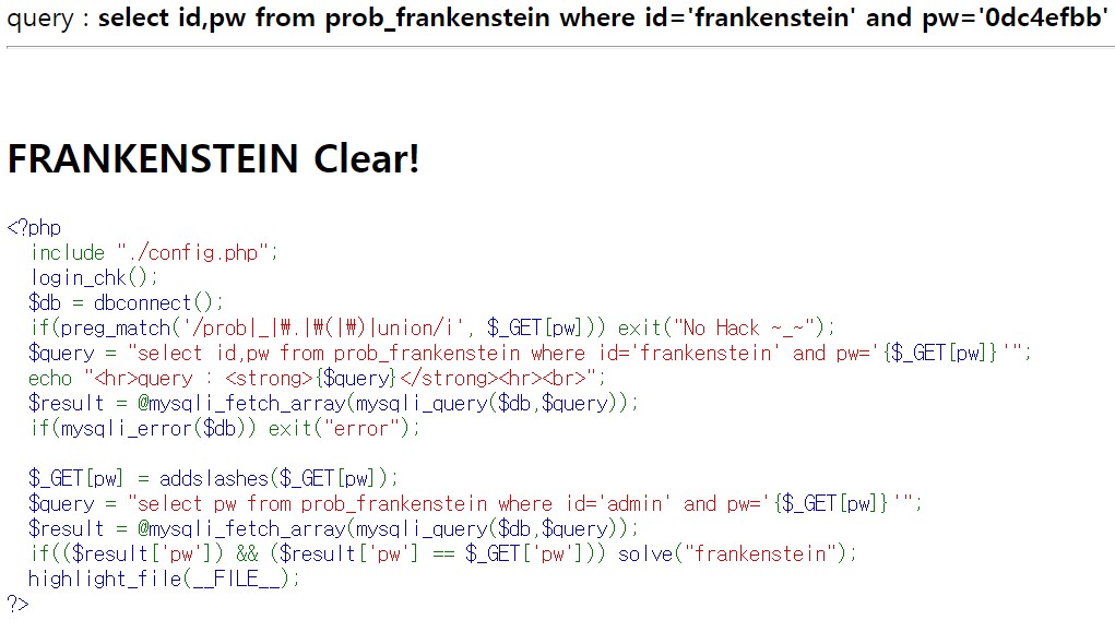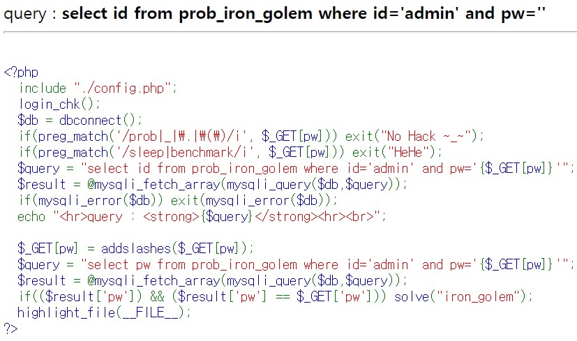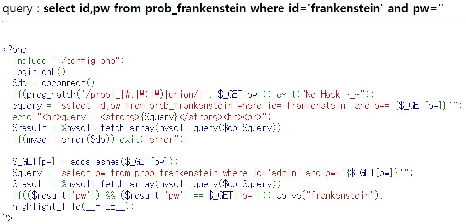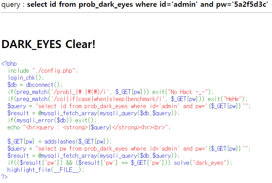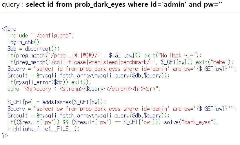 두 번째 query는 pw에 addslash 하고 admin에 대한 정확한 pw를 물어보는 조건문이 붙는다. 즉 Blind SQL Injection이다.