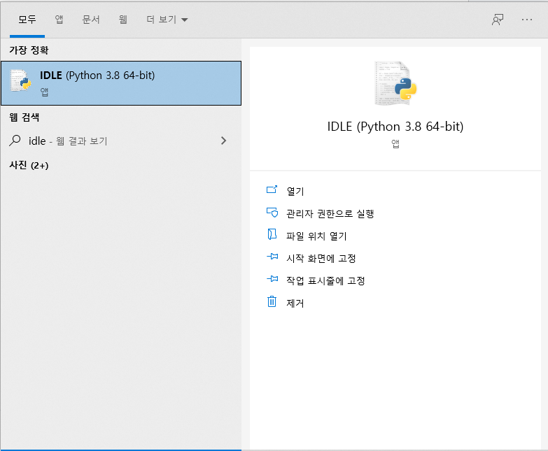 (필자는 3.8의 Python을 사용하고 있으며, 방법대로 3.9.3을 설치한 사용자는 IDLE(Python 3.9 XX-bit)로 표시될 것이다.)