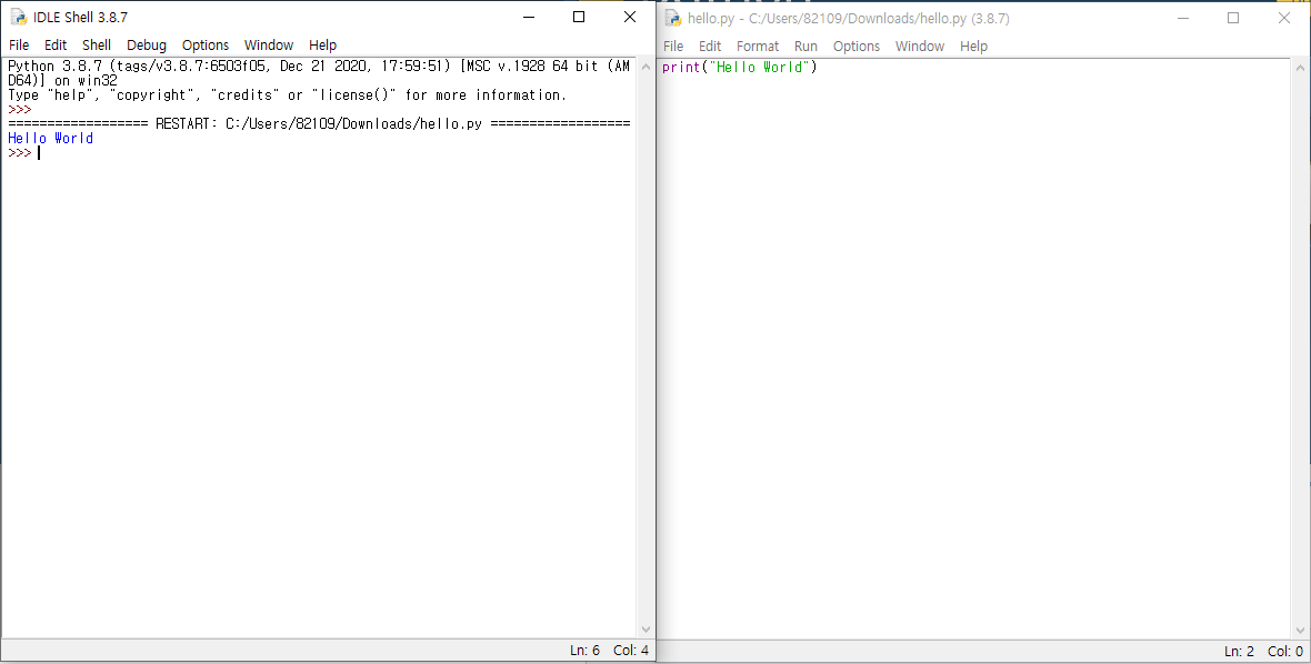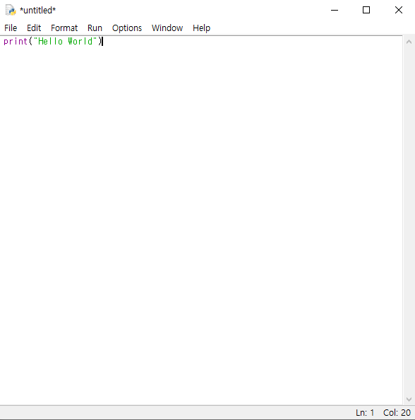 7. 탭의 [Run] - [Run Module](단축키 : F5)를 눌러 정상적으로 실행되는지를 확인하자, New File을 눌렀던 그 창에서 Hello World가 출력되었다면 성공이다.